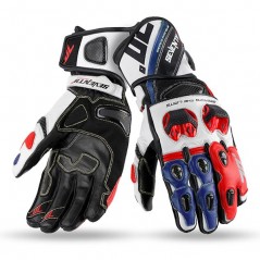 Guantes de verano de estilo racing. Diseñados para competición. Confeccionados en piel bovina full analice y piel sintética. Cosidos con hilo de Kevlar. ¿Guantes transpirables gracias a zonas con piel perforada. Doble cierre en la muñeca para un mayor ajuste. Dedos meñique y anular cosidos entre sí para evitar posibles lesiones. Protecciones de PVC en los nudillos y la palma. ¿Deslizaderas de carbono en los dedos, el dorso y en la muñeca. Inserciones de silicona para un mayor agarre.